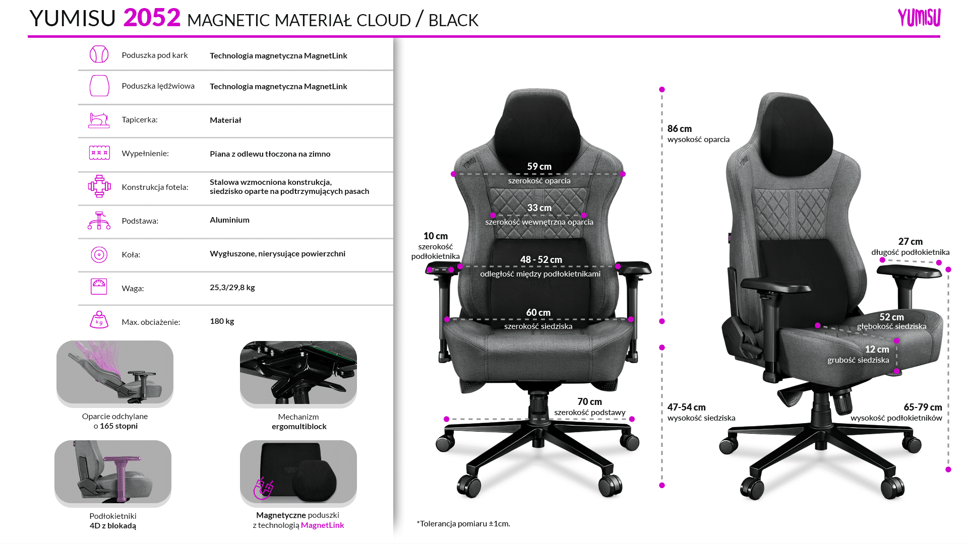 MagnetLink, innowacyjna technologia marki Yumisu, rewolucjonizuje doświadczenie związane z montażem poduszek pod głowę, odcinka lędźwiowego oraz maskownic fotela. Dzięki niezwykłej mocy magnetycznej, łatwo dostosujesz pozycję poduszek, zapewniając sobie niezrównany komfort ergonomiczny.