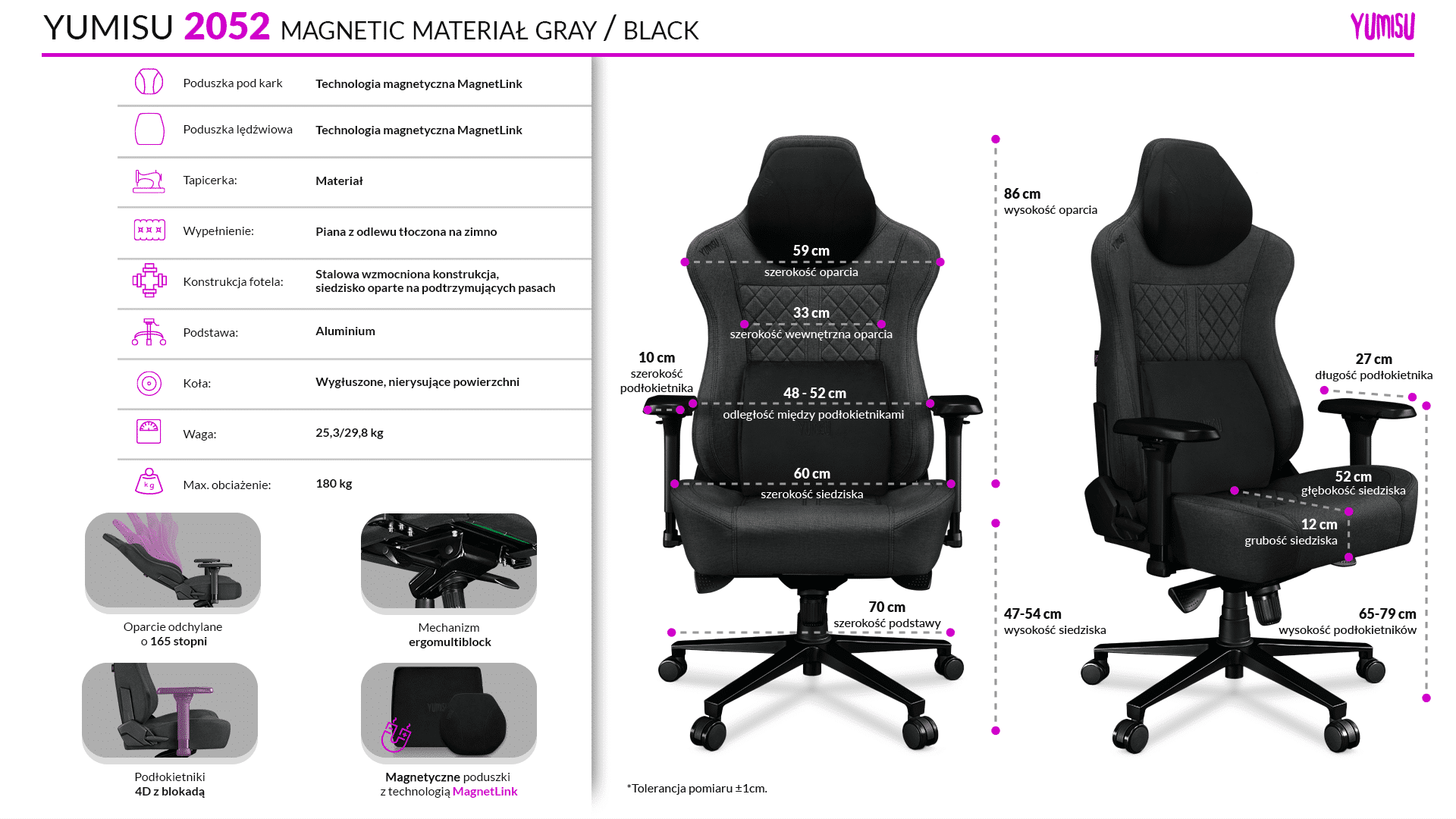 MagnetLink, innowacyjna technologia marki Yumisu, rewolucjonizuje doświadczenie związane z montażem poduszek pod głowę, odcinka lędźwiowego oraz maskownic fotela. Dzięki niezwykłej mocy magnetycznej, łatwo dostosujesz pozycję poduszek, zapewniając sobie niezrównany komfort ergonomiczny.