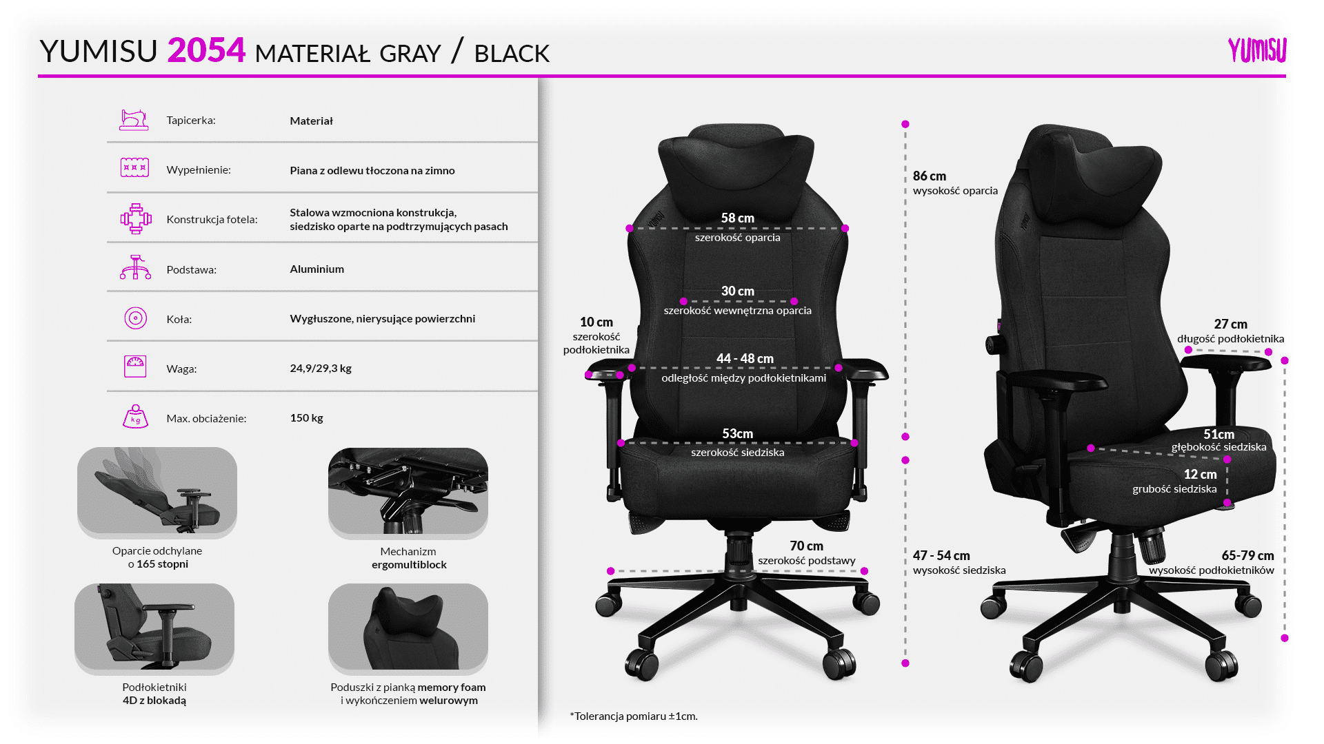 Uniwersalny fotel do zadań specjalnych, który odnajdzie się na każdym froncie? Brzmi jak charakterystyka idealnie skrojona pod fotel Yumisu. Nie wątpimy, że bez problemu dowiedzie swej wartości zarówno przy długim maratonie online, jak i równie wymagającej pracy biurowej. Jeśli bliżej Ci do prostej (ale nie prostackiej!) klasyki niż fotela, który przez wybujałą kolorystykę przypomni Ci najbardziej kolorowe święta, to ponownie – trafiłeś pod dobry adres! Ciemne obicie w eleganckiej szarości przeszyte czarną nicią, dopracowane szczegóły i solidne podstawy to elementy, którymi może pochwalić się ten model. Kolejny poziom komfortu i dopasowania dokładnie tak wygląda!